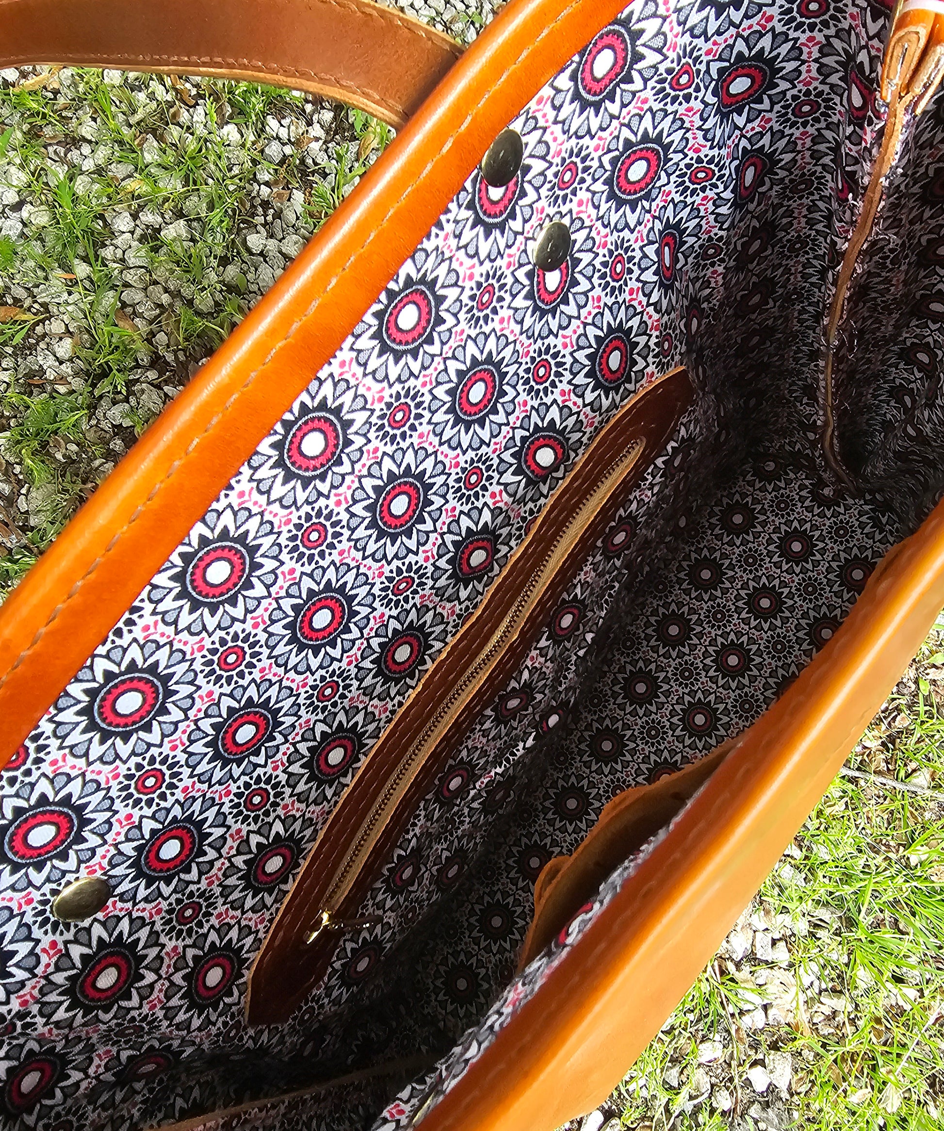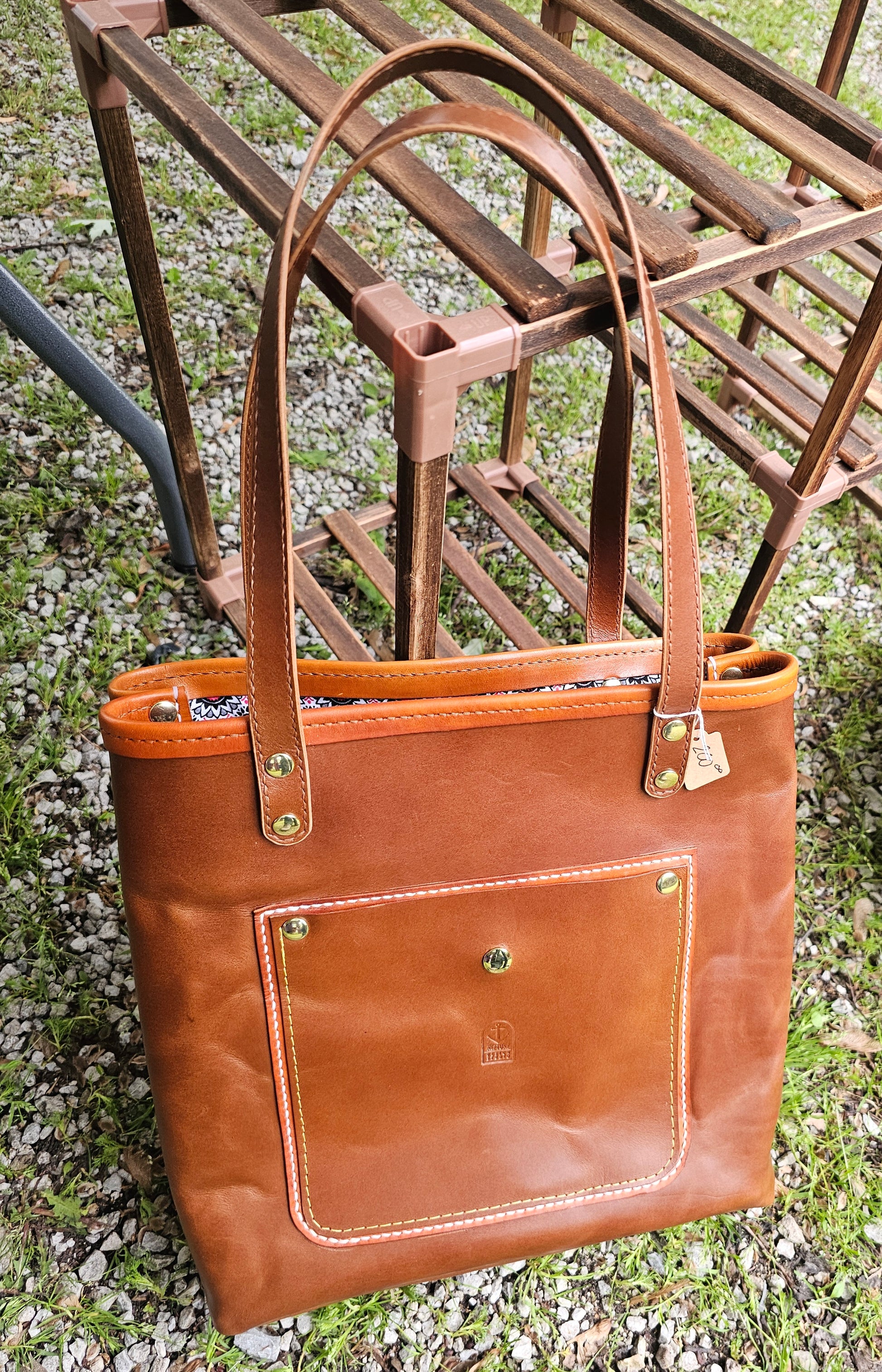 Medium tote bag, fabric lined, with inner zipper pouch, inner leather pocket, and outer magnetic pocket, hand-stitched in Havana Cigar thread. Solid polished brass hardware throughout.